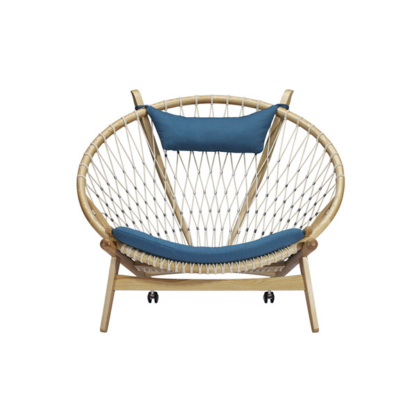 Surprising comfort is derived from a generously padded, concave cushion that is suspended over the rope weave. A small pillow suspends from the two beams supporting the head. The frame is crafted from solid wood; we love the durable organic appeal. The Hans Wegner Hoop Chair contributes real-world functionality, architecture & historic modernism no matter which room it ends up in tomorrow.