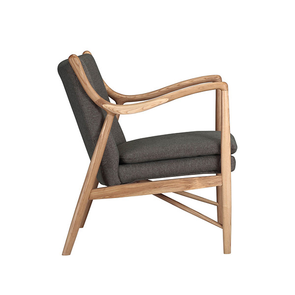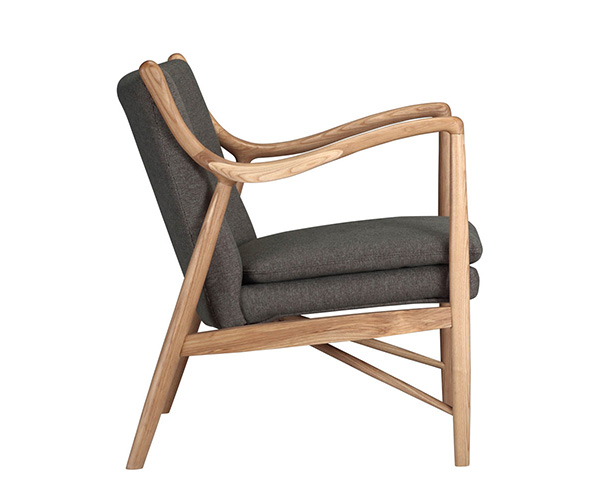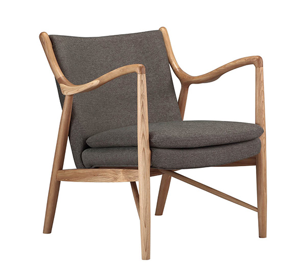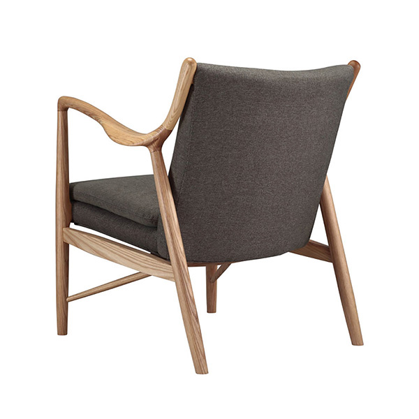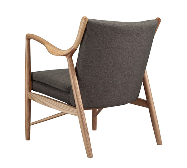 The year was 1945, and Finn Juhl had just released the original model 45 chair. The 45 was a break from the traditional armchair in that the seat and back were freed by design from the frame of the chair. A floating visual from all angles and an architecturally intriguing frame were the bi-products of this newly found freedom. Like the original, this exceptional reproduction features a solid timber American Walnut frame. Finn achieved the drawn-out windswept appearance by drawing the arms upward and forward while the mid seat frame section draws down and toward the back. Comfort is achieved through the foam wrapped and upholstered foam frame and plush multi-density seat cushion.