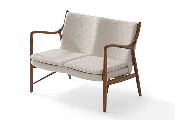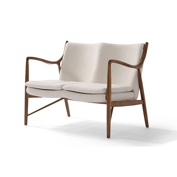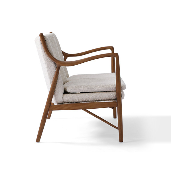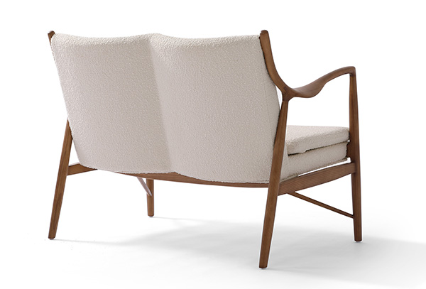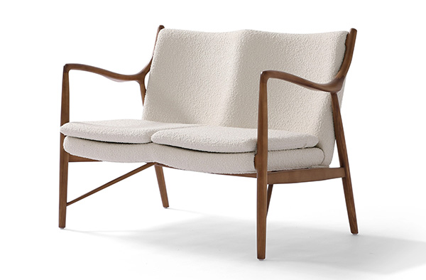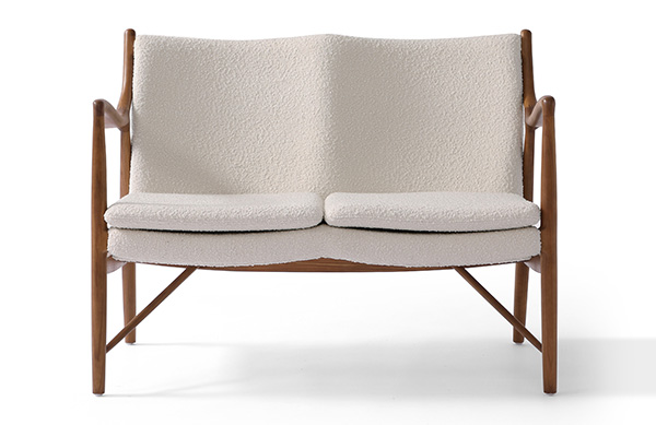 A well-recognized icon of mid-century modern design. Free-flowing, airy and elegant in concept. The original series was created in 1945 by Danish mid-century modern furniture designer Finn Juhl. In handcrafting this mid-century modern masterpiece, the Kardiel Copenhagen '45 combines quality material such as solid American Walnut timbers and durable boucle upholstery with attention to the original intricate design detail.