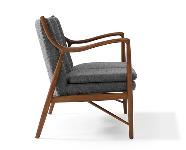 The year was 1945 and Finn Juhl had just released the original model 45 chair. The 45 was a break from the traditional armchair in that the seat and back were freed by design from the frame of the chair. A floating visual from all angles and an architecturally intriguing frame were the bi-products of this newly found freedom. Like the original, this exceptional reproduction features a solid timber American Walnut frame. Finn achieved the drawn-out windswept appearance by drawing the arms upward and forward while the mid seat frame section draws down and toward the back. Comfort is achieved through the foam wrapped and upholstered foam frame and plush multi-density seat cushion.