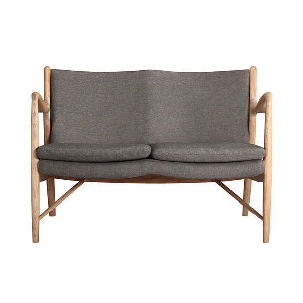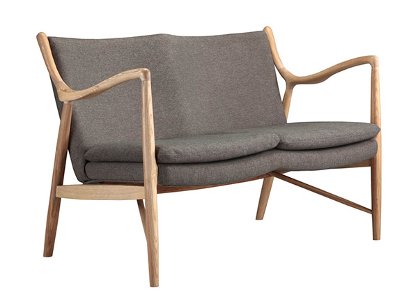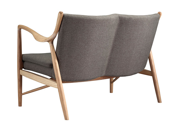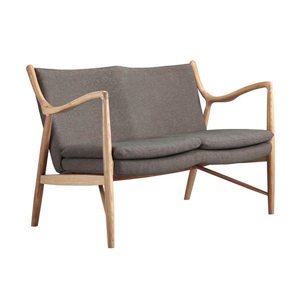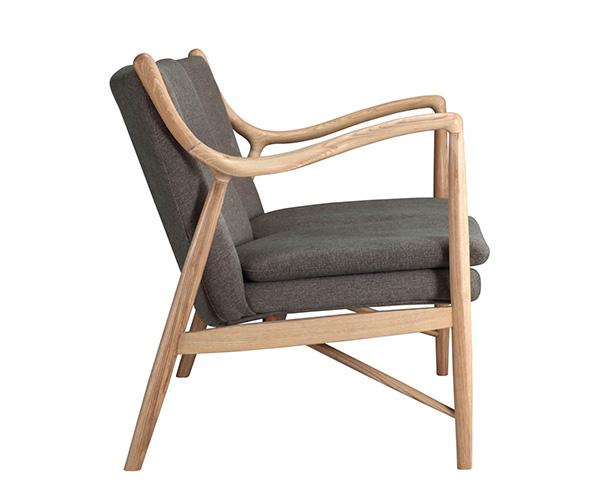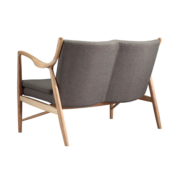 The year was 1945 and Finn Juhl had just released the original model 45 chair. The 45 was a break from the traditional armchair in that the seat and back were freed by design from the frame of the chair. A floating visual from all angles and an architecturally intriguing frame were the bi-products of this newly found freedom. Like the original, this exceptional reproduction features a solid timber American Walnut frame. Finn achieved the drawn-out windswept appearance by drawing the arms upward and forward while the mid seat frame section draws down and toward the back. Comfort is achieved through the foam wrapped and upholstered foam frame and plush multi-density seat cushion.