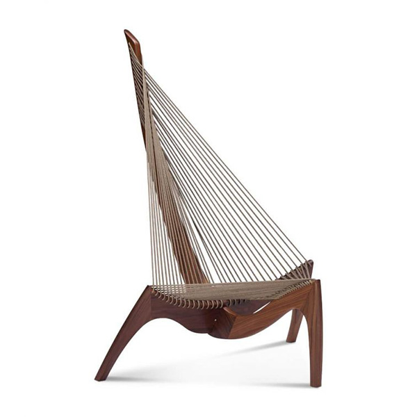 Designed by Jorgen Hovelskov, the Harp chair is a a unique piece of modern Danish design. Inspired by the arching curves of the bow and stern of a Viking boat, the chair was originally named the Viking Chair when exhibited for the first time in 1963. The woven rope's resemblance to the strings of a harp, meant it was later named by a journalist as the Harp Chair.