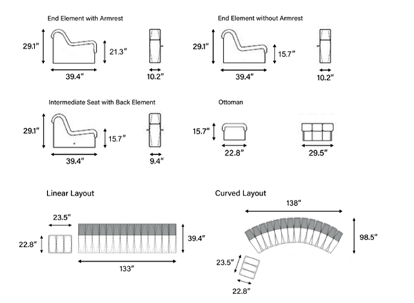 Combination B: End Element with Armrest (left and right) x 1 + End Element without Armrest (left and right) x 1 + Intermediate Seat with Back Element x 12 + Ottoman x 1