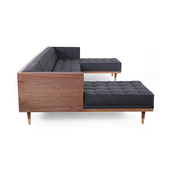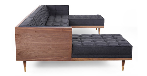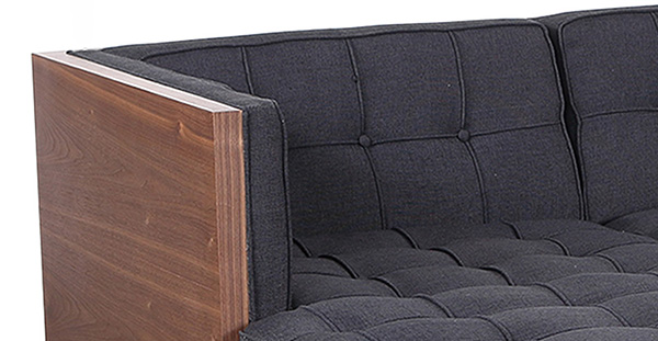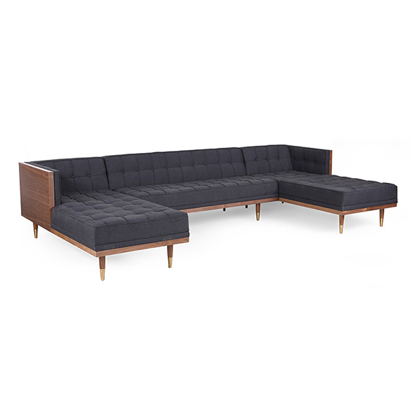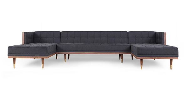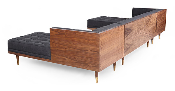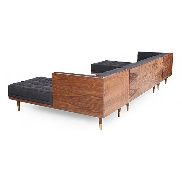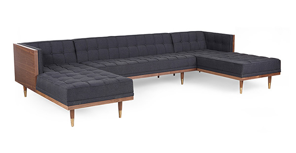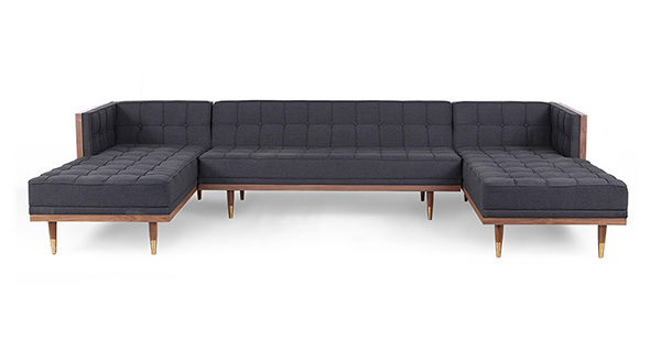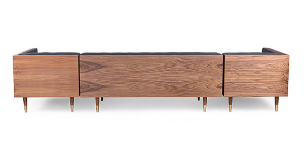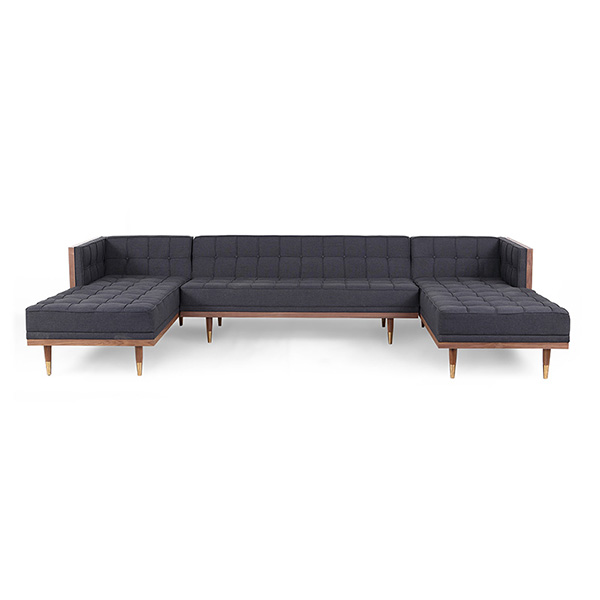 WOODROW MID-CENTURY MODERN SOFA U-SECTIONAL Clever, fresh & inspired by the 1950's modernist movement. At first glance, it may seem like a straight-up seating angle. However, the frame design within the wood outer frame is intently engineered with a degree of backward angle seating, tilt to the back. This combined with the soft, low profile full-length interior cushion, provides a surprisingly comfortable back pitched lounging experience.