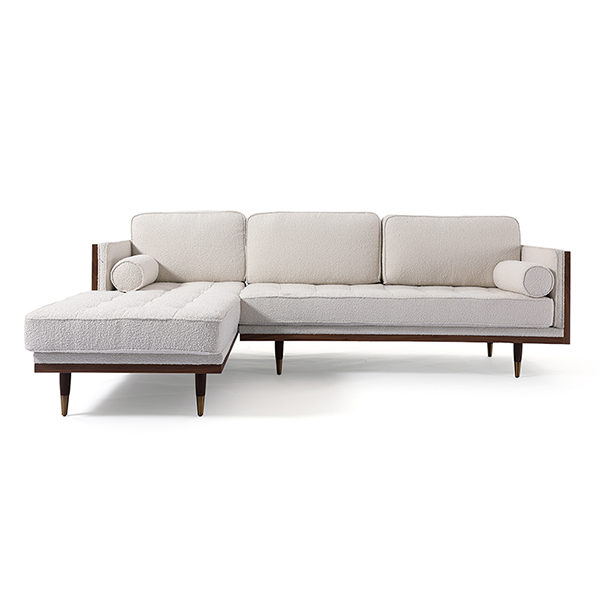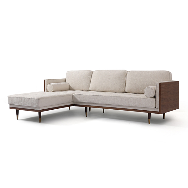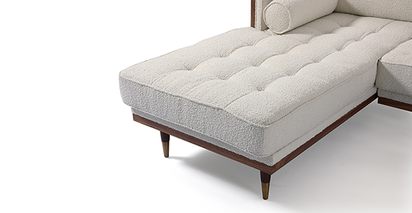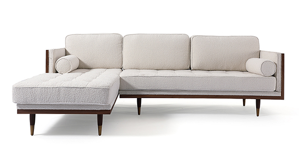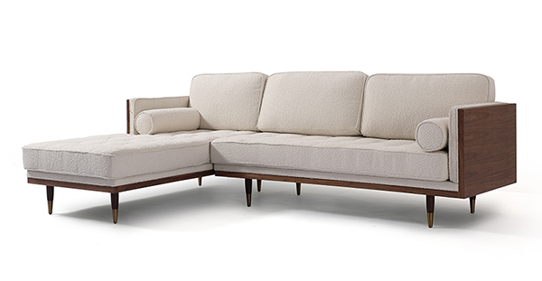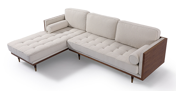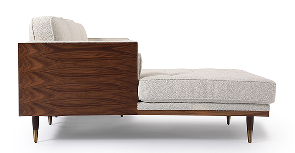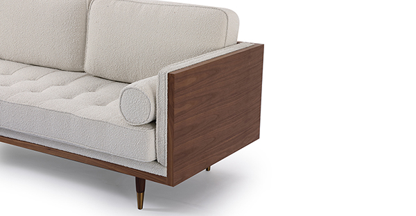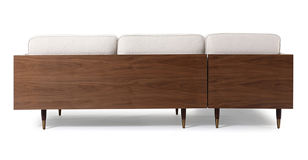 This elevated chaise sectional is meant for feet up, laid back lounging. Skandi is our contemporary, comfortable, American Walnut sofa. Feels like we’re introducing tomorrow's classic. We love napping on the cylindrical side pillows and we can vouch for the comfort. It's something we’ve engineered into the generous full width seat cushion and supporting spring system.