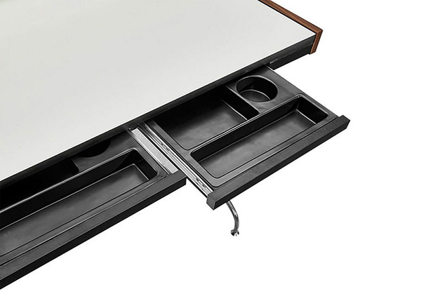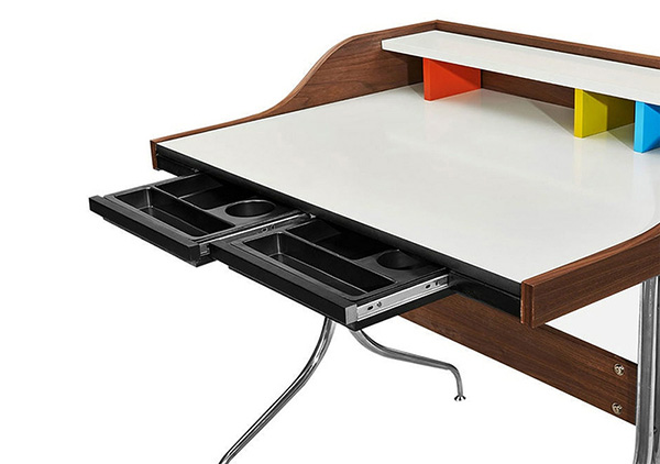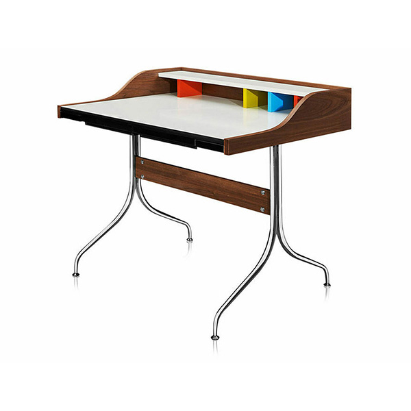 This was long before laptops, tablets, and smartphones. What he did not realize at the time is that this small desk makes exceptional use of space and compliments these small scale electronics perfectly. Used both office and home settings, the Swag Desk fits exceptionally well into tight spaces. The white Melamine laminate desk surface provides a clean sharp work surface, a defining contrast to the dark walnut and a neutral canvas from which Chartreuse, Spa Blue, and Orange dividers pop forward.
