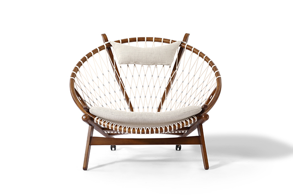 Surprising comfort is derived from a generously padded, concave cushion that is suspended over the rope weave. A small pillow suspends from the two beams supporting the head. The frame is crafted from solid wood; we love the durable organic appeal. The Hans Wegner Hoop Chair contributes real-world functionality, architecture & historic modernism no matter which room it ends up in tomorrow.