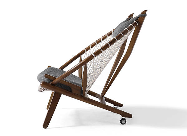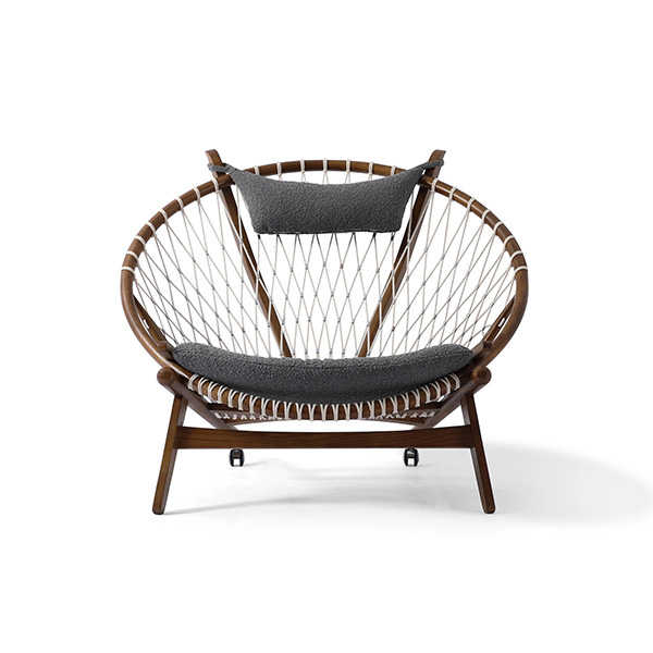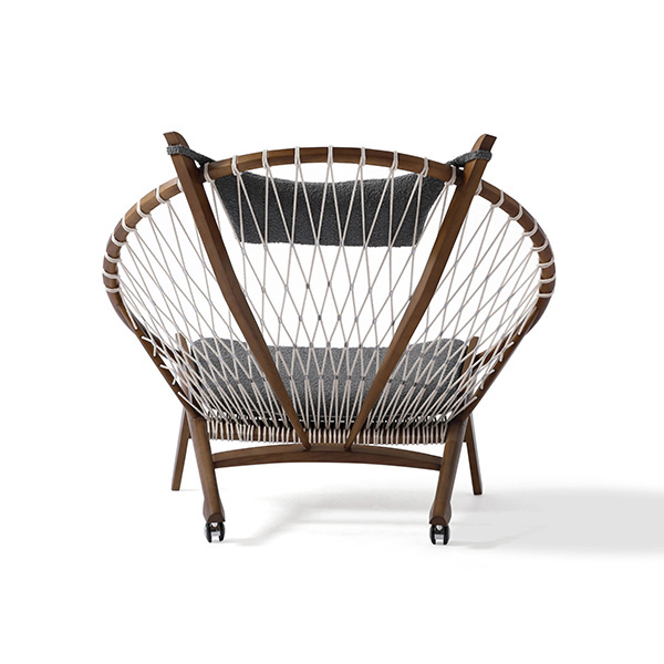 Surprising comfort is derived from a generously padded, concave cushion that is suspended over the rope weave. A small pillow suspends from the two beams supporting the head. The frame is crafted from solid wood; we love the durable organic appeal. The Hans Wegner Hoop Chair contributes real-world functionality, architecture & historic modernism no matter which room it ends up in tomorrow.