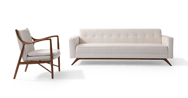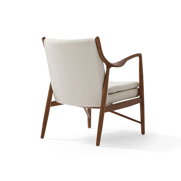 A well-recognized icon of mid-century modern design. Free-flowing, airy, and elegant in concept. The original series was created in 1945 by Danish mid-century modern furniture designer Finn Juhl. In handcrafting this mid-century modern masterpiece, the Kardiel Copenhagen '45 combines quality material such as solid American Walnut timbers and boucle upholstery with attention to the original intricate design detail.