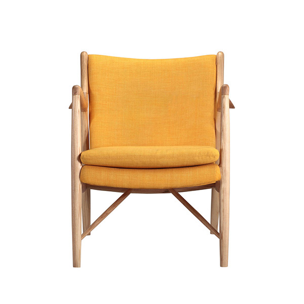 The year was 1945, and Finn Juhl had just released the original model 45 chair. The 45 was a break from the traditional armchair in that the seat and back were freed by design from the frame of the chair. A floating visual from all angles and an architecturally intriguing frame were the bi-products of this newly found freedom. Like the original, this exceptional reproduction features a solid timber American Walnut frame. Finn achieved the drawn-out windswept appearance by drawing the arms upward and forward while the mid seat frame section draws down and toward the back. Comfort is achieved through the foam wrapped and upholstered foam frame and plush multi-density seat cushion.