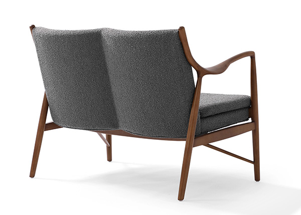 A well-recognized icon of mid-century modern design. Free-flowing, airy and elegant in concept. The original series was created in 1945 by Danish mid-century modern furniture designer Finn Juhl. In handcrafting this mid-century modern masterpiece, the Kardiel Copenhagen '45 combines quality material such as solid American Walnut timbers and durable boucle upholstery with attention to the original intricate design detail.