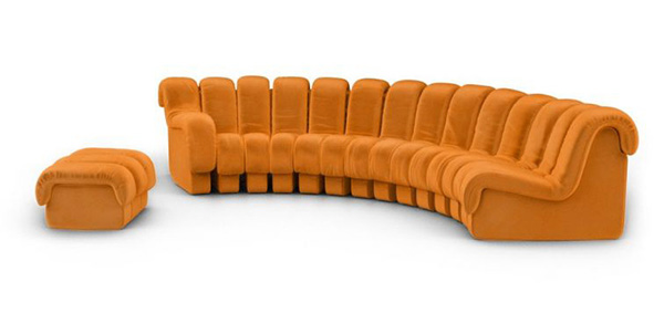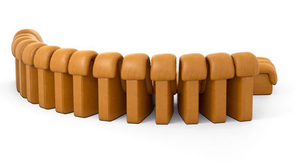 The DS 600 Sofa "non-stop" sofa was designed by Ueli Berger in 1972. Named after a mythical alpine creature, the Tatzelwurm, the DS sectional sofa is composed of narrow modular elements that can be expanded to create seemingly endless shapes. It is designed to allow for a combination of varying elements, rendering it possible to create a multitude of compositions. By always using the same module, you could technically create the longest sofa in the world, and in your space, you could create your unique design based on the needs of the environment. The sofa can be configured in countless different ways - from the iconic curve (as shown), an arc form or even a straight line - and everything in between.